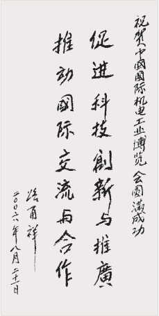 | 圖為路甬祥為機電博覽會作的題詞 |