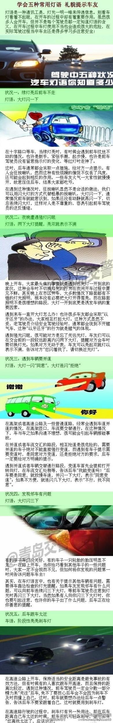 開車不會燈語,相當于人不會說話。綠燈亮了,前車不走,別狂按喇叭,可用大燈閃一下;鄰車大燈閃了三下,可能是自己的車出了問題;后車跟太近,可階段性亮亮剎車燈……“青島交警”總結出5種最常用燈語,轉走學習!學用燈語是禮貌文明的體現哦~~~
