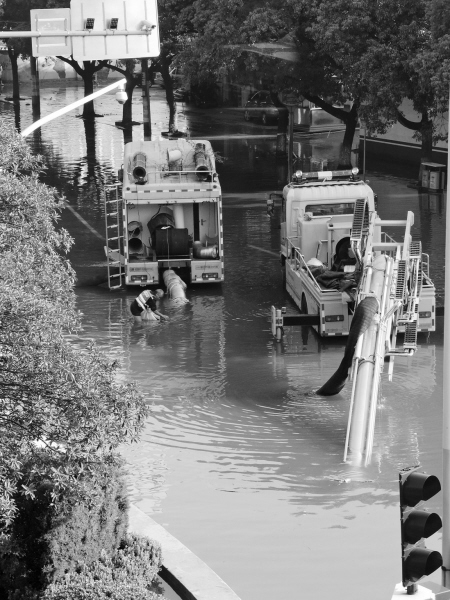昨天,在柳汀公鐵立交橋下,市城管排水公司的兩輛大型排水車、十幾臺大型抽水泵在不間斷抽水。記者龔國榮攝