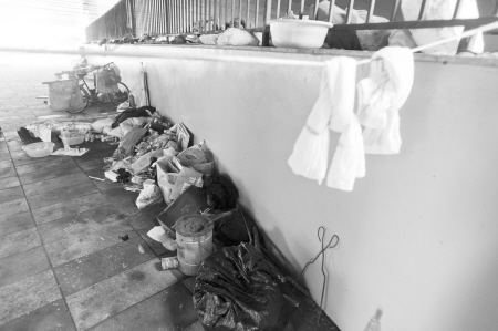 昨天下午,記者來到琴橋下,看到靠近西邊的幾個橋洞下擺著十多個鋪蓋行李,還放著做飯用的灶具和換洗的衣物等,地上一片狼藉,散發出陣陣刺鼻的氣味。有兩名男子正在睡覺,看到有記者前來采訪,躲開了。