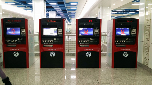 一字排開的四臺自動售票機,在外觀上采用2號線主色調紅色為主的紅黑搭配H型,時尚經典;在高度上,由2米降低到1.8米,造型更穩重可靠,同時通過內部結構優化,將紙幣投入口由1.55米降低到1.35米,方便老人和兒童購票;同時,進一步優化內設軟件,購票找零更快捷;觸摸屏由紅外線屏幕改為電容屏,支持多點觸摸,人機交換操作更便捷。