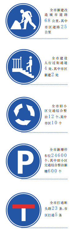 周守權(quán)表示,我市今年將按照“建環(huán)線、打卡口、接斷頭、微循環(huán)、增車位”的總體思路,繼續(xù)深化“交通治堵”行動,推進城市道路設(shè)施建設(shè)。全市將新建改造城市道路68公里,包括南湖路、德政東路、牛山南路等;打通影響交通通行的斷頭路23條,建設(shè)人行過街通道4處,開展舊小區(qū)交通綜合整治12個,新增停車位600個;完善停車位建設(shè)規(guī)劃,鼓勵社會力量參與投資,加快立體、地下停車場建設(shè),新增停車位24000個。加強地下空間開發(fā)利用,完成以綜合管廊和停車位建設(shè)為重點的地下空間開發(fā)利用200萬平方米。