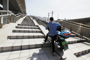 昨天,市民艱難地推著電動自行車上鄞州南翔橋輔橋。由于坡度太大,把車子推上去得出一身汗。