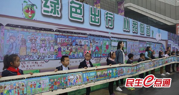 活動現場,一側是“綠色出行從我做起”征文征畫評選活動的獲獎作品展示,獲獎的30多位小記者用文字和畫筆勾勒出的他們心目中的綠色出行藍圖。居中一幅是寧波市藝術實驗學校的孩子們描繪的30米長卷“幸福快車”,孩子們用了幾個月的時間,畫出了一幅行進中的地鐵列車,上面滿載著小朋友的期盼與希望。