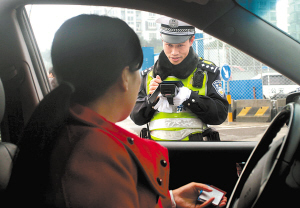 昨天,海曙交警在轄區主要路口開展交通整治行動。交警提醒,邊開車邊玩手機的行為非常危險,發生事故的概率是正常駕駛的兩三倍。圖為交警在中山西路與環城西路交叉口查處開車“低頭族”。