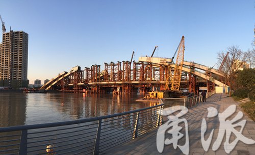 目前,該工程拱肋臨時支架已全部搭設完成,正進行橋梁拱肋安裝和焊接、防撞墻施工以及桃源街南側地面輔道施工等。