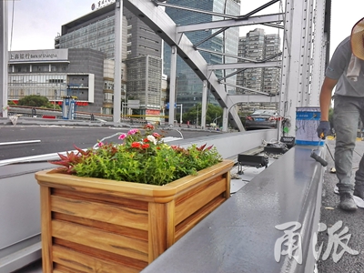 橋拱下隔離帶中的盆栽花藝清新而優雅。