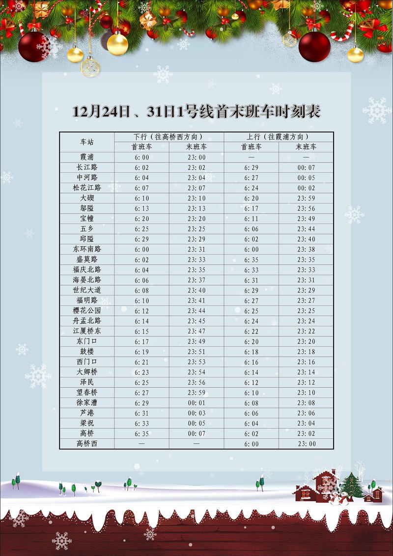12月24日、12月31日當天,地鐵運營時間為6:00—23:00,共計17小時,較平日延長1小時。