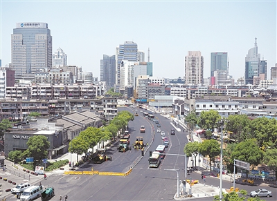 昨天,驕陽似火,城市核心區(qū)重要南北向道路解放路上一派繁忙施工景象:一臺(tái)大型瀝青攤鋪機(jī)不斷將滾燙的瀝青攤鋪在水泥路面上,工作人員在路面忙著指揮車輛、壓平路面。