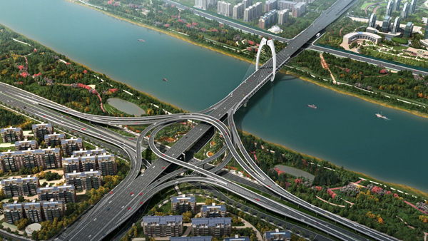 大橋共分為四個標段,其中IV標段位于江北區,為云飛路—北環快速路段,長度為932米,跨度為50米。值得一提的是,北環快速路節點采用五層“迂回半定向苜蓿葉”全互通立交,即快速路西間通過轉向道溝通,地面輔道平交燈控。