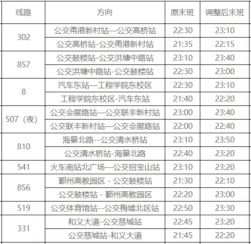 其中,302路、8路、507(夜)路、810路、856路雙向延遲40分鐘,857路雙向延遲半小時,331路雙向延遲35分鐘,519路體育館站往梅墟北區站方向單向延時40分鐘,541路火車南站北廣場往公交招寶山站方向單向延遲10分鐘發車。