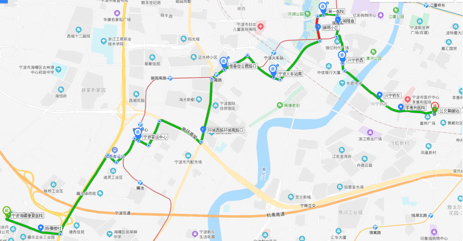 站點設置:寧波海曙康復醫院、博宏工業區↓、陳橫樓村、段塘東路通達路口(寧波客運中心)、環城西路環城南路口、恒春街云霞路口、寧波火車站南、鎮明小區、第一醫院、城隍廟、興寧橋東、李惠利醫院、公交黃鸝站。