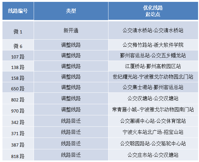 從2022年1月起至3月,將新開通公交線路1條,優化調整11條公交線路,具體情況如下表一: