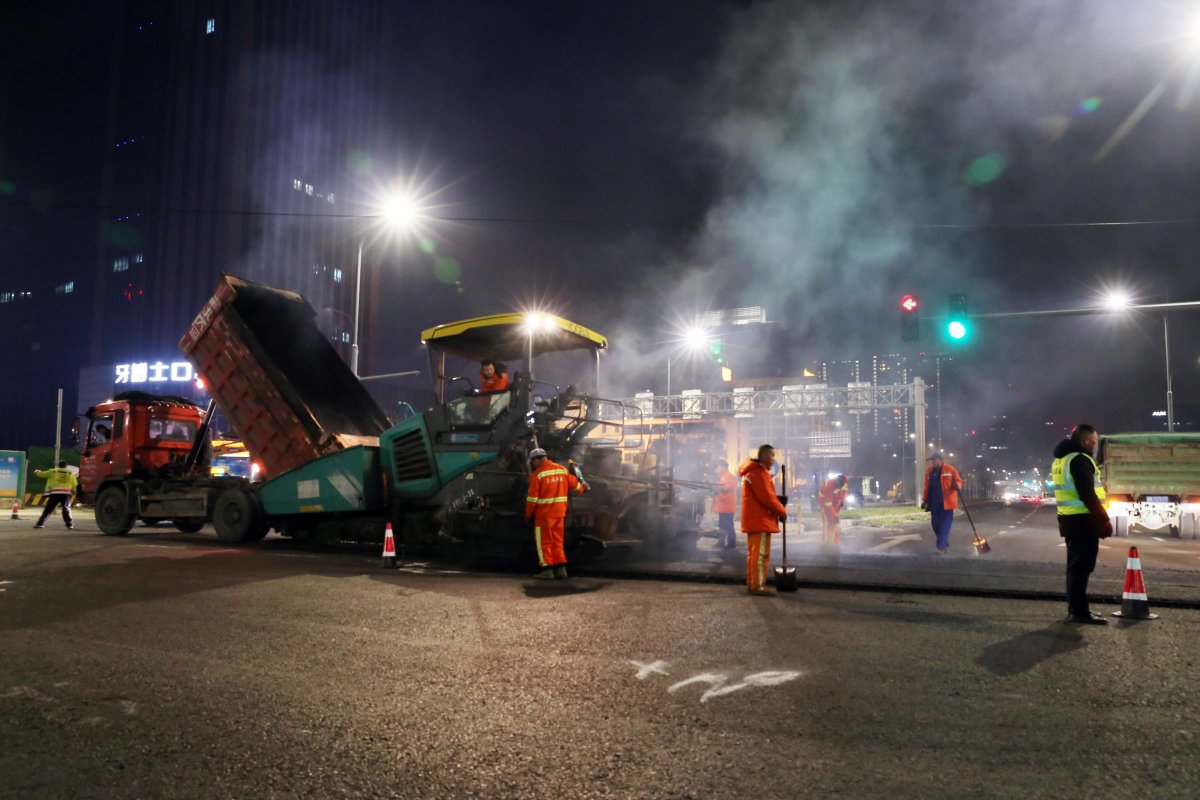 從2月28日晚9時開始,在鄞縣大道天童南路口施工現(xiàn)場,近20臺瀝青車源源不斷地運(yùn)來施工材料,經(jīng)過高溫加熱的瀝青冒出騰騰熱氣,被攤鋪機(jī)傾倒在路面。隨后,工人們“趁熱打鐵”,在推土機(jī)、壓路機(jī)等大型機(jī)械的協(xié)助下,以最快的速度用鐵鍬把瀝青迅速攤平、反復(fù)碾壓,確保道路面層瀝青粘合密實(shí)。至3月1日凌晨5時,該路口完成瀝青攤鋪?zhàn)鳂I(yè),出行環(huán)境大幅提升。