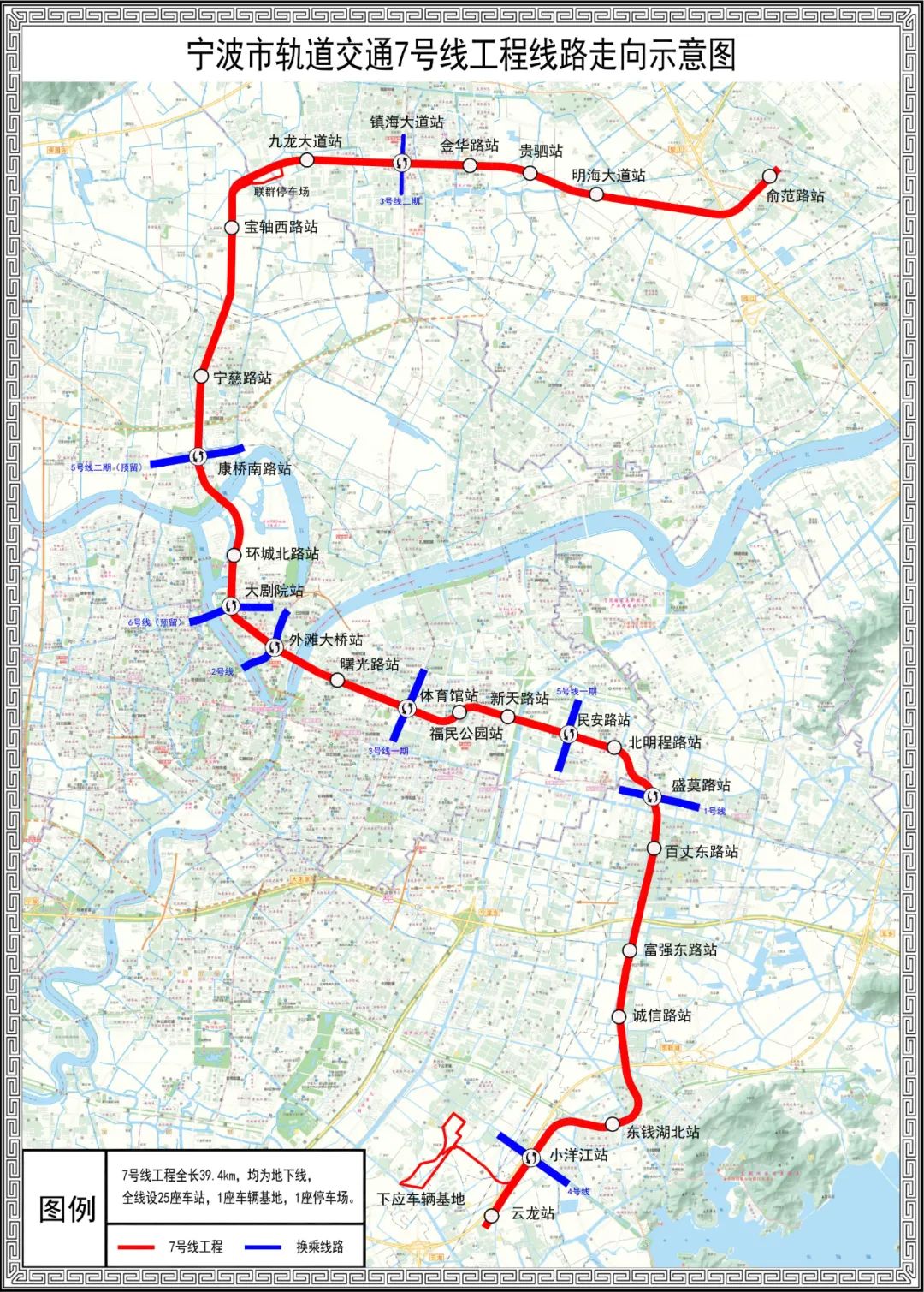7號線線路南起東錢湖地區,穿越邱隘鎮、東部新城、老外灘、灣頭、莊橋、鎮海新城,最終到達俞范組團,線路依次經過鄞州區、江北區和鎮海區。線路全長約39.4km,全部為地下線,設站25座。