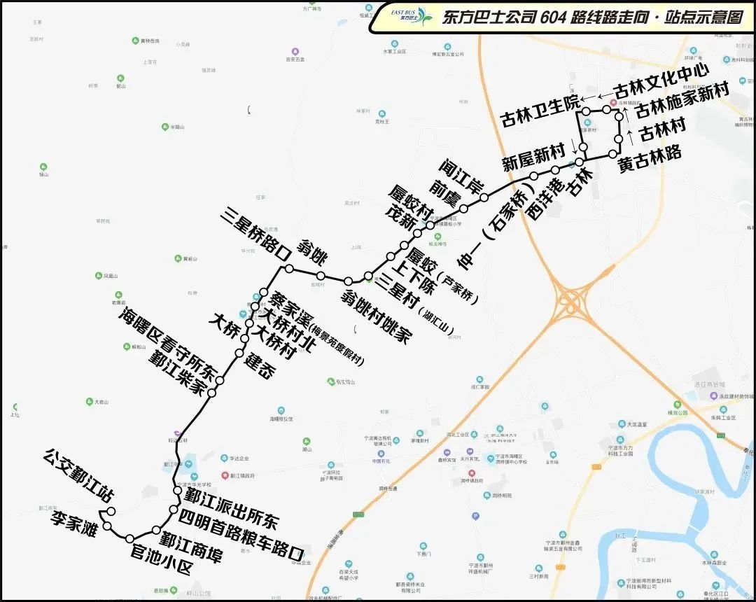 二、公交鄞江站經(jīng)建岙村至黃古林路的部分604路建岙班次調(diào)整為公交鄞江站至建岙村運(yùn)營(yíng),并編碼為604-1路