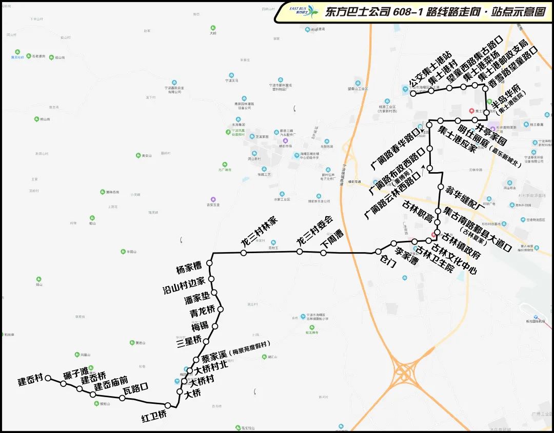 三、公交集士港站至公交烏頭門站的608路部分班次調(diào)整為公交集士港站至建岙村運(yùn)營(yíng),并編碼為608-1路