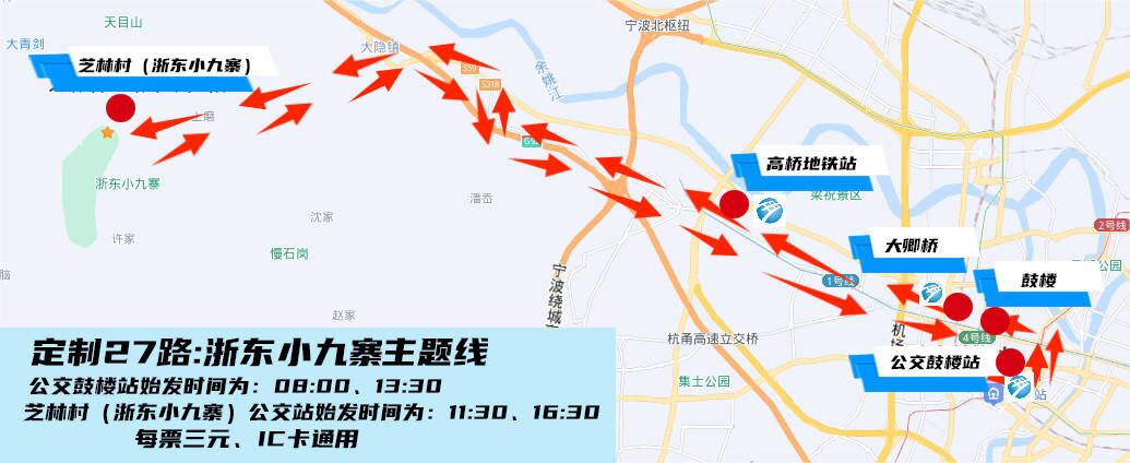 該線從公交鼓樓站出發,沿途經過鼓樓、大卿橋↓、中山西路翠柏路口↑、高橋地鐵站,最后到達芝林村(浙東小九寨),公交鼓樓站始發時間為 08:00、13:30,芝林村(浙東小九寨)公交站始發時間為:11:30、16:30。單程80分鐘,線路沿線經過軌道交通1號線鼓樓站、大卿橋站、高橋站,可進行公交換乘。該線三元一票制,IC卡通用。