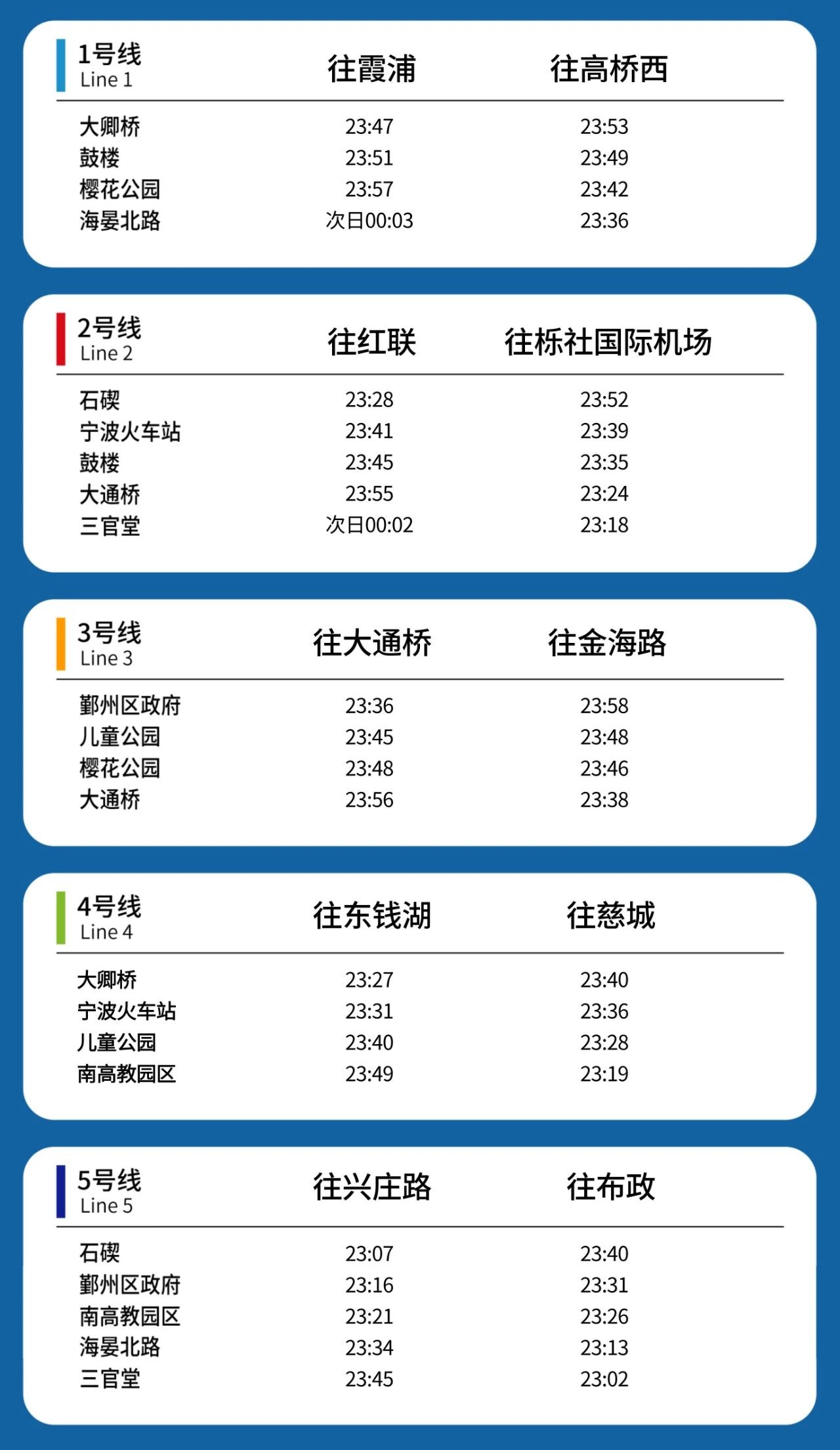 4號線慈城往東錢湖方向?yàn)?3:00,東錢湖往慈城方向?yàn)?3:10;