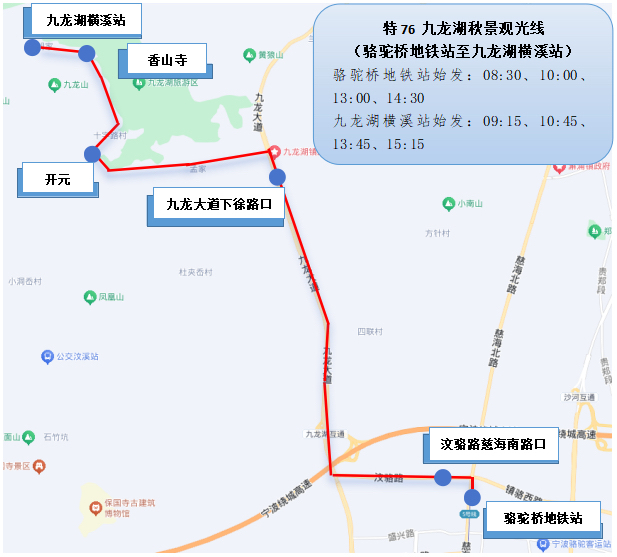 寧波公交集團將于10月1日起開通特72、特73、特74、特76“游在金秋”特色線,可達天下玉苑、保國寺、鄞州生態走廊、九龍湖橫溪等秋游好去處。4條出游線路全部實行二元一票制,采用大站快線的運營模式,為市民朋友假期出游提速。