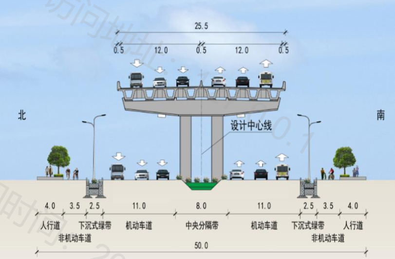 快速路主線布置為雙向6車道,設(shè)計(jì)車速為80公里/小時;地面輔道建設(shè)規(guī)模為雙向6車道,設(shè)計(jì)車速為50公里/小時。高架段標(biāo)準(zhǔn)斷面寬度50米,地坪段標(biāo)準(zhǔn)斷面寬度88米。
