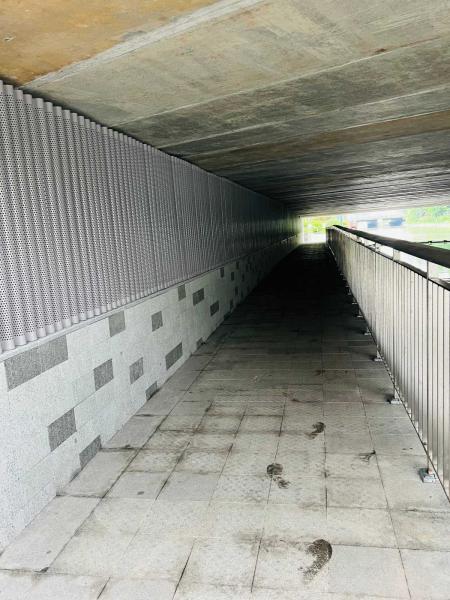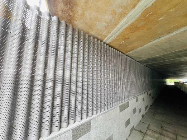 為提升景觀品質,在下穿通道工程中,市政園林管理科從設計到施工實施全過程指導,在通道入口周邊種植了風車茉莉、迷迭香等花境植物,精心打造綠化景觀。通道內墻面采用圓形鏤空金屬板裝飾,既隱藏燈帶又增添美感,夜間通行更顯溫馨。