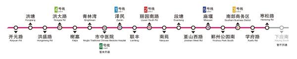 8號(hào)線一期與既有線均設(shè)有換乘:澤民站與1號(hào)線換乘,麗園南路站與2號(hào)線換乘,南部商務(wù)區(qū)站與3號(hào)線換乘,洪大路站與4號(hào)線換乘,廟堰站與5號(hào)線換乘。市中醫(yī)院站與未來建成的6號(hào)線換乘。