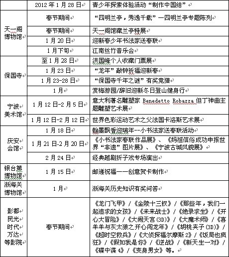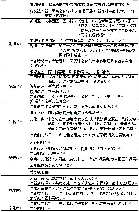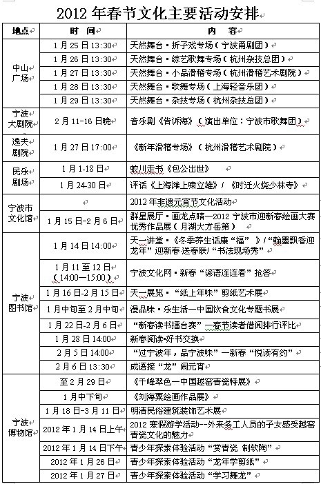 春節(jié)期間,寧波將為市民呈獻饕餮“文化大餐”! 2012年寧波春節(jié)文化活動由“廣場活動、影劇欣賞、展覽展示、特色活動”四大系列近千項活動組成,將充分體現(xiàn)“文化惠民”的理念,努力為廣大群眾營造歡樂、喜慶、祥和、文明、健康的盛世節(jié)日氛圍。
