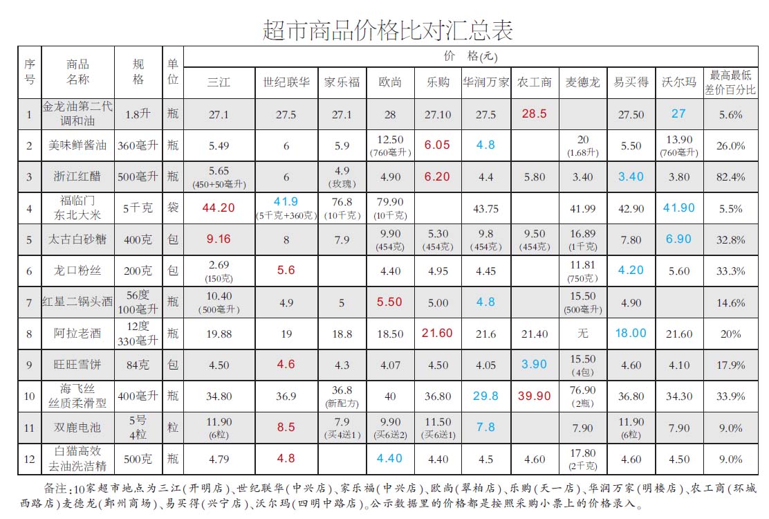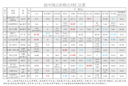價格比較結果顯示:同一品牌、同一品種、同一規格的商品,在不同超市價格不一,最高與最低零售差價的百分比大多在10%以上,其中500毫升浙江紅醋差價最大,達82.4%。旺旺雪餅、紅星二鍋頭等8種商品的最高價比最低價高出10%以上;阿拉老酒、美味鮮醬油等6種商品的最高價比最低價差額幅度超過20%;龍口粉絲、太古白砂糖等4種商品的最高價比最低價高出30%以上。市消保委相關負責人表示,他們之所以對這些民生商品進行價格調查,是希望通過不斷公布民生商品的信息,方便消費者自行選擇超市購買,通過消費者手中的“貨幣選票”來達到平抑物價的目的。