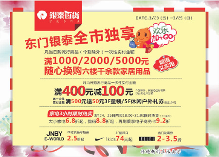 銀泰百貨東門店、鄞州店3.23--3.25打折信息