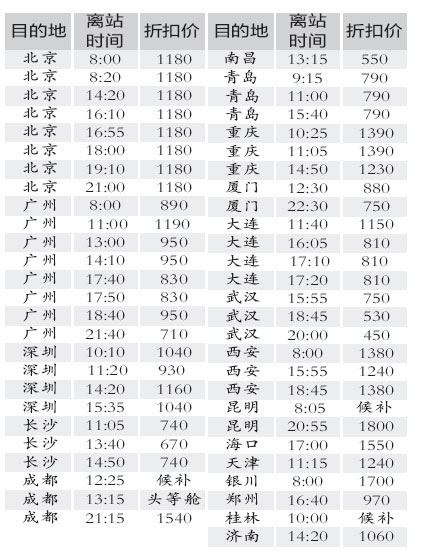 注:按中航信電腦截至昨日16點的信息編制,僅供參考,以上價格均不含稅。24小時售票熱線:88886666、88887777、13336668686,市區內免費送票。
