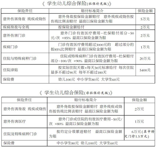 對比兩個方案發現,盡管保障額度各有側重,但是兩種承保方案的保費是一樣的,大學生為60元,中小學生為80元,幼兒園幼兒為100元。