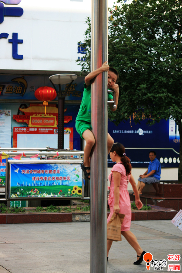 愛爬桿似乎是男孩的天性。見著旗桿,手腳并用,嗤溜一聲就爬了上去,真是只可愛的“小猴”。