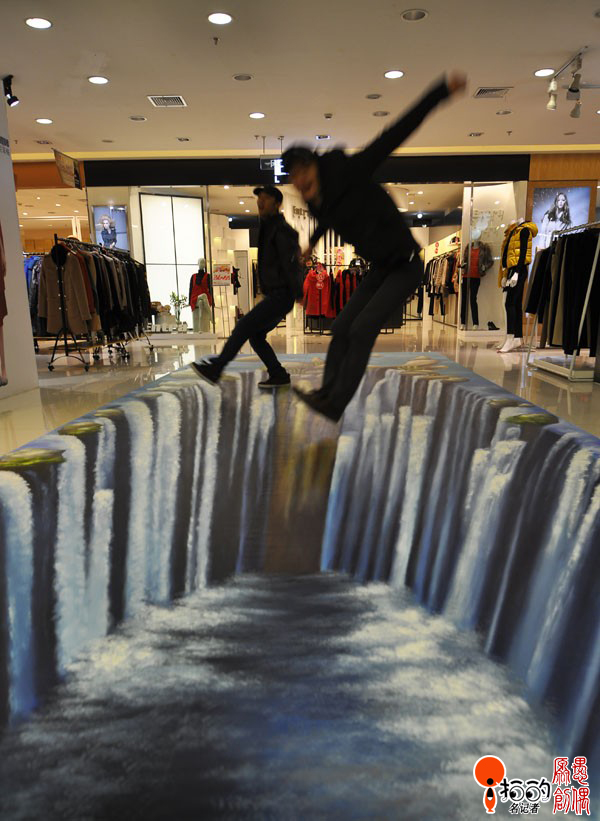 中國寧波網手機記者愚偶: 這幾日去新華聯商廈,你會驚奇地發現,本該待在動物園的猛虎不安份地跑到了商場四樓,黃果樹大瀑布也被移居至商場三樓。當然這是不可能的,呵呵。這是浙江美院學生的3D作品,怎么樣,讓人身臨其境吧。