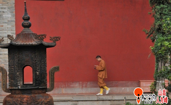 信息時代,手機時代,微博時代……大佛寺里一僧人邊走邊玩,或許正在微博或許正在瘋狂的小鳥!呵呵,不寂寞的時代!