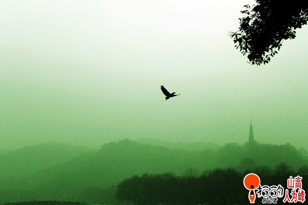 雨中的西湖,山色蒙蒙,一只鳥兒飛翔,天空不留痕跡,卻在鏡頭里定格了一個美麗的剪影。