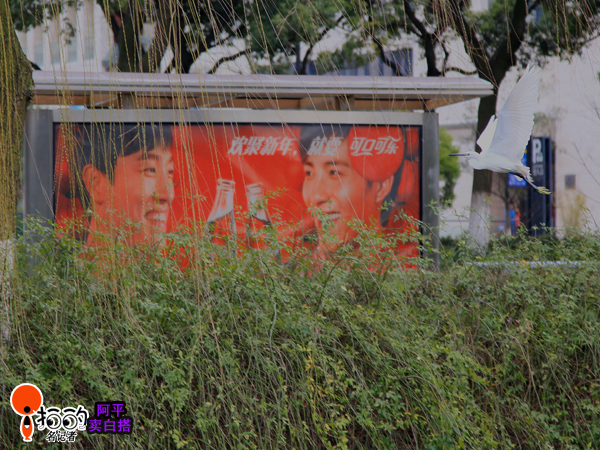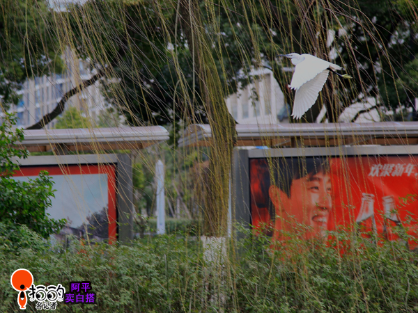 中國寧波網手機記者阿平賣白搭:中午帶著相機在大劇院附近尋找目標,發現一只白鷺在覓食,我撥好快門,悄悄地靠近,但最終還是被它發覺了,當它起飛那一刻,我按下快門,仔細一看,竟然和劉翔的廣告牌拍到一起了,白鷺飛向劉翔,那就叫飛翔吧!