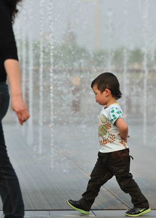 小男孩被媽媽呵斥不能玩水了,氣嘟嘟的跟在大人后面離開噴泉池。