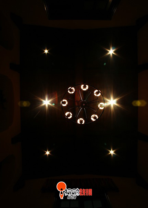 一次去朋友家串門,突然躺在沙發上仰頭一看,感覺他家的天花板上的燈光太美麗了,就好像夜空的星星和月亮一樣,于是就拍攝了這張美麗的家里的星空!