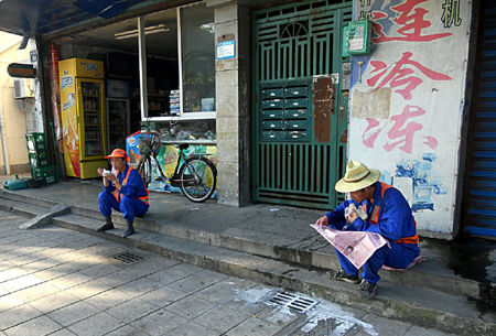 2012、7、31,晴,中山廣場,藍天白云下,彩球飄空.......而“倒掛”著的“2012寧波購物節開幕”的紅條幅卻更加顯眼!或許是給“外星人”看的吧!