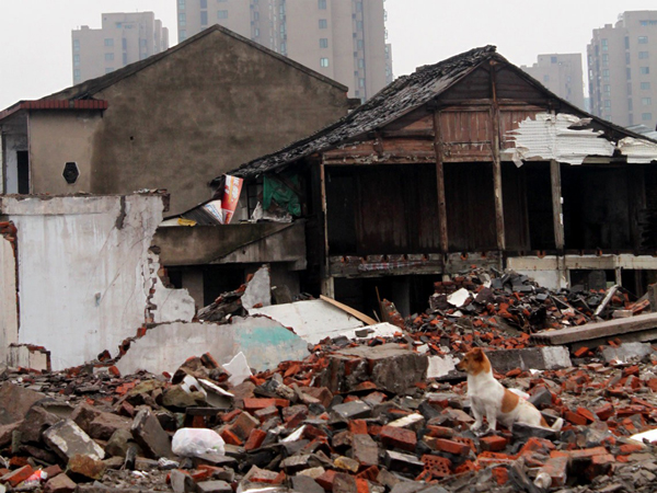 :一片斷瓦殘壁,狗狗你在等誰呢?是你的主人嗎?——不曾離去的狗仔,帶著對家的留戀,無聲地守望著……