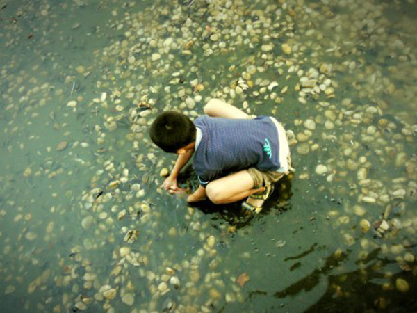 :池塘換水,孩童抓魚,童年童趣,兒時記憶。
