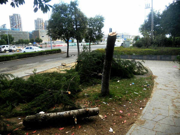 :鄞州區學士路與泰康中路十字路邊,不知要何年才能長成的“參天大樹”,不知何時,不知何因,不知被何人“斬首”了,陳“尸”現場……