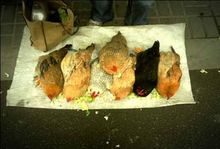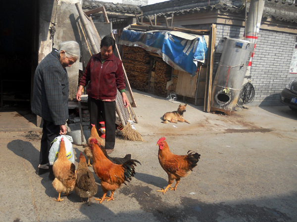 :阿婆買菜歸來,村頭閑聊,一群雞仔,紛紛向菜袋子圍攏過來,食葉嘗鮮……
