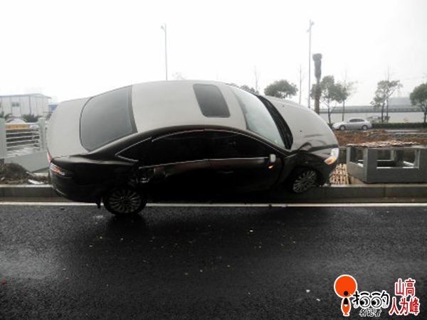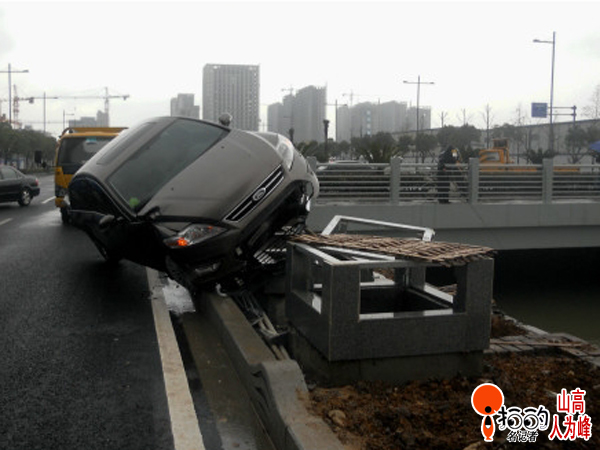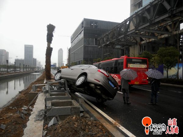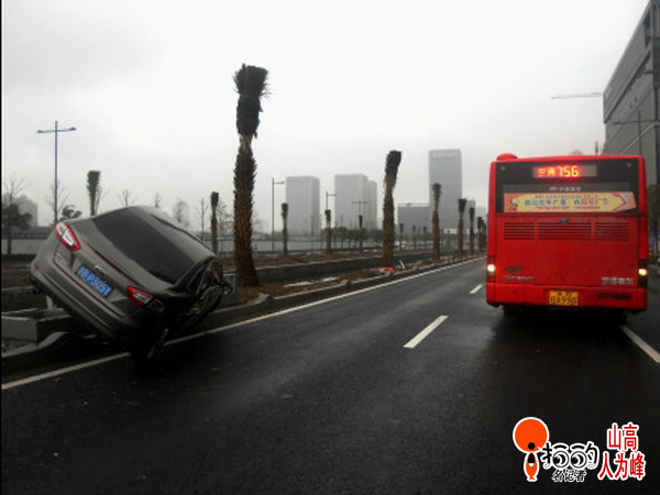 中國寧波網“i拍”記者山高人為峰:驚駕東路上一輛福特小車左轉彎時速度過快,被直行的756路公交車扛上了。長安福特車學起了“鳥叔”當場跳起了江南style……幸運的是被路邊的石礅擋了一下,否則就要跳到河里去了。