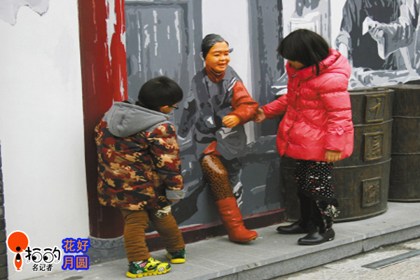 在鼓樓步行街,孩子們對一個新設置的破墻而出的雕像很好奇,忍不住上去摸摸,好像在試試真假。