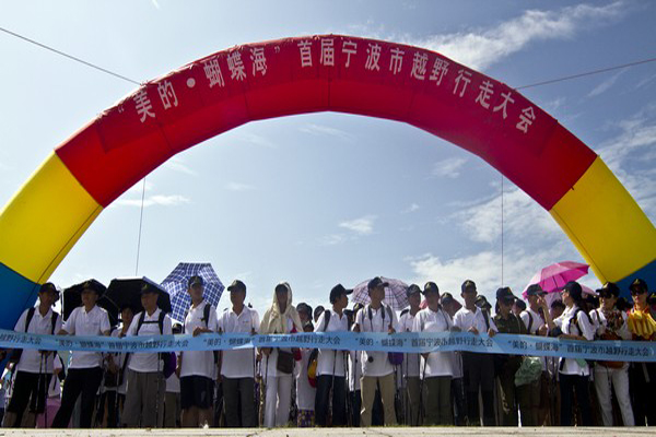 昨天上午,我市300多位戶外運動愛好者人人手持兩根步行杖,在梅山保稅港區參加了今年我市全民健身月主題活動之一———“美的·蝴蝶海”首屆寧波市越野行走大會。