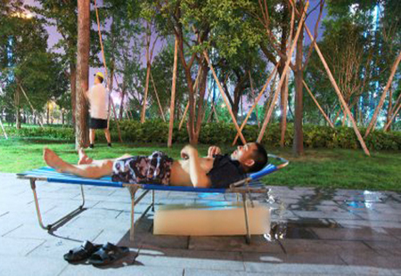 天氣炎熱,早晚活動的人越來越多,這位坐在輪椅上的老奶奶張開雙臂要去抓飛過的蜻蜓。7月29日清晨拍于槐樹公園。