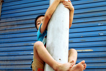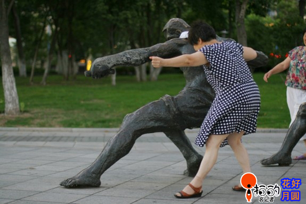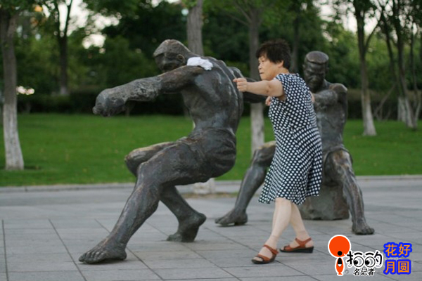 鎮海沿江路公園有一組銅像雕塑,是幾個拉船的纖夫,一位晨練大媽也學著雕塑的姿勢擺了個POSE,大家看看這個大媽的模仿秀怎么樣?