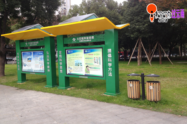 中國寧波網“i拍”記者過云雨:攝于寧波濠河公園。兩座美麗的太陽能科普畫廊正在發揮它的作用,太陽能科普畫廊頂部安裝了太陽能電池板、感應器、蓄電池等配件。太陽能科普畫廊主要采用圖片、漫畫的形式向群眾傳播大量科普知識。太陽能科普畫廊成寧波宣傳節能、倡導低碳的一道亮麗風景線。